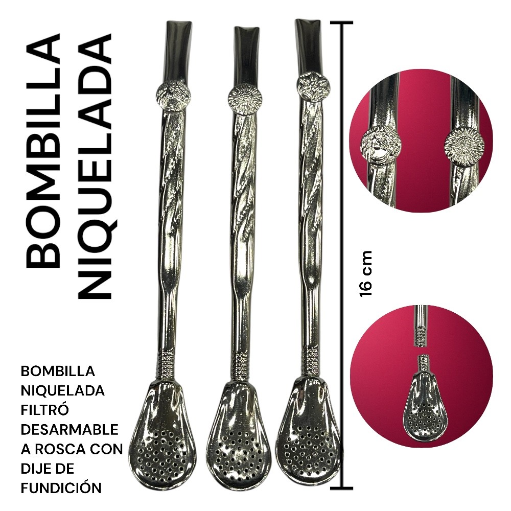 Bombila con baño de niquel y aplique gauchescos.